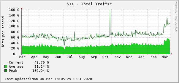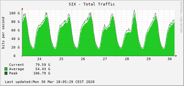 Promet na slovenskem stičišču internetnih omrežij SiX v preteklem tednu (Arnes).